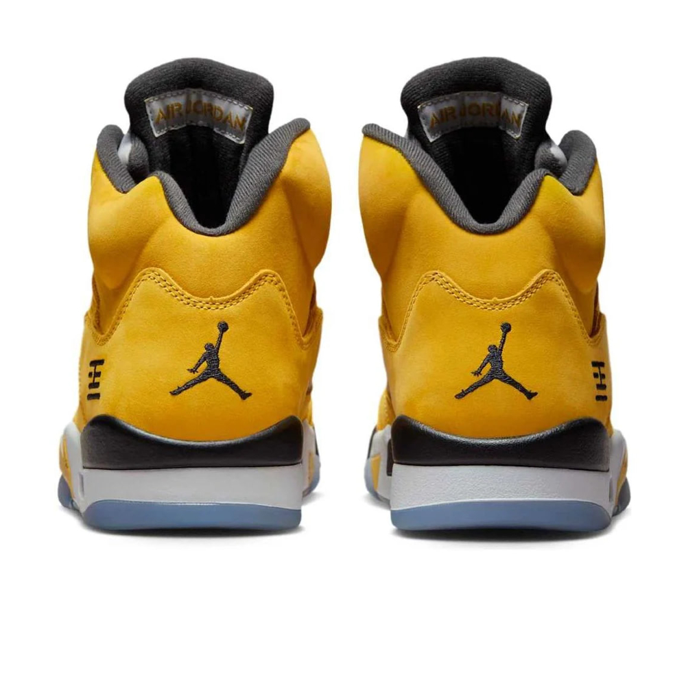 This AJ5 draws from Tokyo’s vibrant energy with a yellow suede upper, translucent mesh panels, and kanji “23” embroidery. Black-speckled shark teeth, a reflective tongue, lace toggle, and visible Air unit combine style and comfort, finished with icy herringbone traction.
